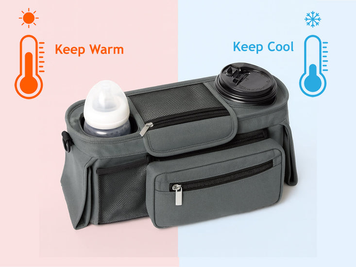 Keep drinks and essentials within reach! Fits most strollers and holds cups up to 3.14”—Stanley, Yeti, baby bottles, sippy cups, and more. Smart pockets and insulated holders make outings easy.
